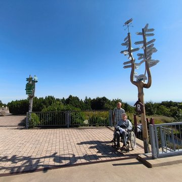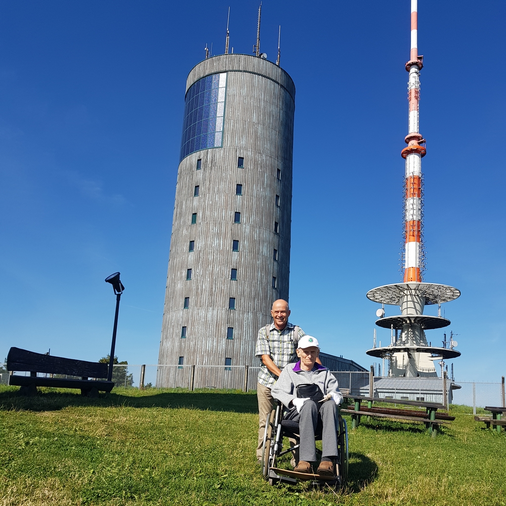 Wir sind mit dem Auto (mit dabei Gehstützen und Rollstuhl) zuerst zu seinem Sohn Siegfried nach Georgenthal gefahren. Dort ist Siegfried zugestiegen und es ging zum Inselsberg. Zum Glück konnten wir bis zum Berggasthof Stöhr fahren. Dann ging es mit dem Rollstuhl über das ganze Plateau. Es war schon beschwerlich bei den Steigungen und nicht rollstuhlgerechten Untergründen, aber so ist Natur. Berggasthof und Aussichtsturm hatten geschlossen, so dass nur wenige Leute dort unterwegs waren. So konnten wir in Ruhe die Aussicht genießen.
