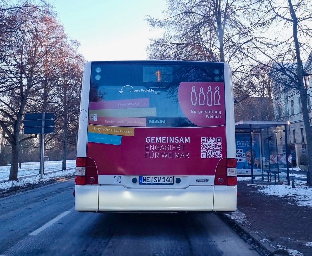 Für die nächsten drei Jahre wird ein Weimarer Stadtbus mit unserer Werbung unterwegs sein.