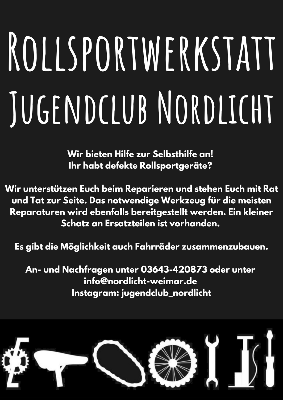 Zwischen Jugendclub und Skatepark befindet sich ein Container – die Rollsportwerkstatt, die nun wiederbelebt werden soll. Hier können junge Menschen unter Anleitung ihre Skateboards, Scooter oder Fahrräder reparieren.