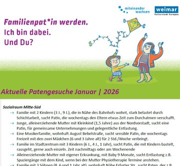 - Weimar West: Sabine Vent, Tel. 0160 1607867, E-Mail: familienpaten.weimar@awo-mittewest-thueringen.de