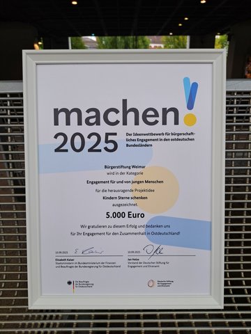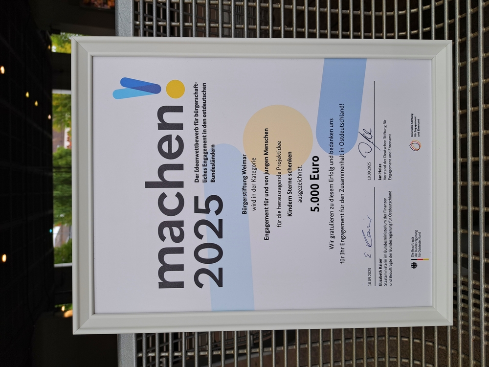 Elisabeth Kaiser, Beauftragte der Bundesregierung für Ostdeutschland, und die Deutsche Stiftung für Engagement und Ehrenamt (DSEE) haben die besten 200 Ideen ausgewählt. Darunter das Förderprojekt KINDERN STERNE SCHENKEN unter dem Dach des Kinder- und Jugendfonds der Bürgerstiftung Weimar.