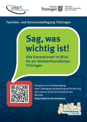 Im Auftrag des Thüringer Ministeriums für Soziales, Gesundheit, Arbeit und Familie (TMSGAF) führt das gemeinnützige Forschungsinstitut ORBIT e.V. eine Onlinebefragung von Familien und Seniorinnen und Senioren in Thüringen durch.