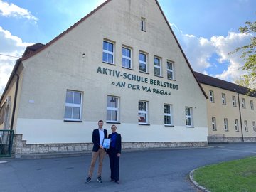Geschäftsführer Dr. Holger Keitel und Frau Dr. Susanne Hausbrandt von den SGHG Ingenieuren aus Jena besuchten am 2. Oktober den Schulteil des Lyonel-Feininger-Gymnasiums in Berlstedt, um das Angebot KINDERN STERNE SCHENKEN live in Augenschein zu nehmen. Die großzügige Firmen-Spende von 10.000 €, die kurz vor den Herbstferien symbolisch an Katrin Katzung (Vorstandsvorsitzende Bürgerstiftung Weimar) übergeben wurde, ermöglicht dem rein spendenbasierten Wissensprojekt viele weitere Besuche in Schulen Weimars, bzw. des Weimarer Landes.