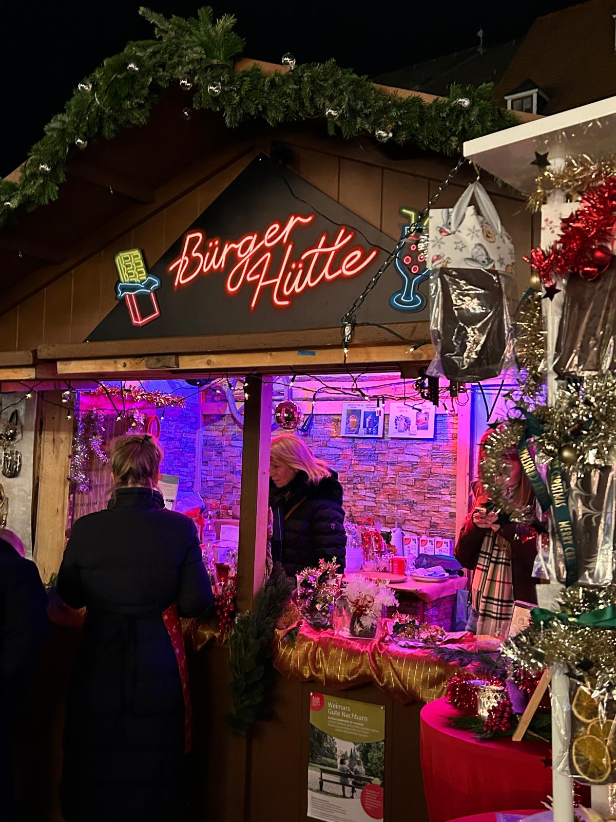 Die Hütte war ein echter Hingucker, unter anderem weil Nils Jänisch das Schild BÜRGER-HÜTTE extra für diesen Anlass professionell gestaltet hatte. Die Neonwerbung wies sogar auf die Produkte des Abends hin, die in liebevoller Kleinarbeit extra für den Abend kreiert wurden.