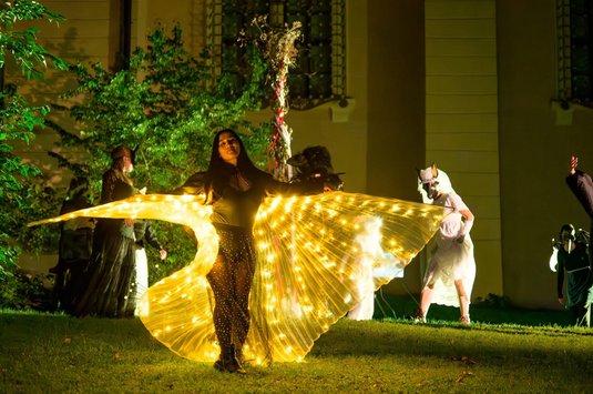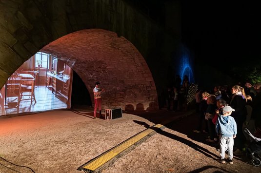 Neben durch die Fassaden-Projektionen der Genius-Loci-Festivalbeiträge illuminierten Gebäude, werden mit Unterstützung eines DNT-Dramaturgen und DNT-Darsteller/innen zwei Szenen des Faust-Themas, inszeniert von S.-L. Rauschert aufgeführt.